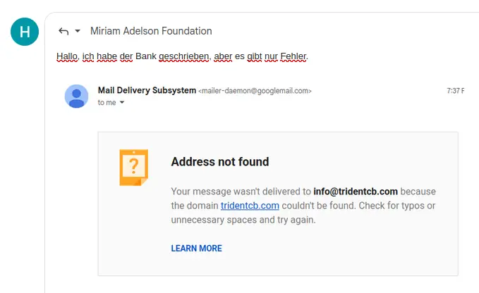 - Die Bank-Wende: Plötzlich ist es nicht mehr die Centurion Bank, sondern die Trident Capital Bank in New York. Die Scammer wechseln die Namen wie Hugo seine Unterhemden. 👕
