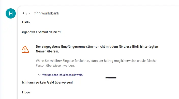 Die Antwort der “Bank” lässt tief blicken – anstatt professionell auf Hugos Rückfrage einzugehen, heißt es plötzlich: