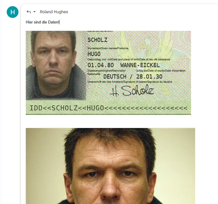 Hugo hat geliefert! Er schickt dem „Anwalt“ ein Dossier, das in jedem Geheimdienst-Archiv für Schnappatmung sorgen würde. Ein Geburtsdatum am 1. April 🤡, der Geburtsort Wanne-Eickel ⚒️ und ein fälschungssicherer Gockel-Hintergrund 🐓, mehr Sicherheit geht nicht!