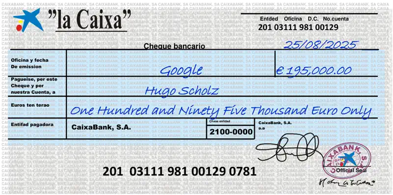 Und da ist er endlich, der Haken: Bevor die 195.000 € auf unser Konto wandern, will die „CaixaBank“ erst mal 495 € für die Eröffnung eines neuen Premium-Kontos – weil wir ja angeblich noch keins haben. Alternativ dürfen wir den Scheck auch per Kurier bestellen, für schlappe 421 € Express-Versand. Google zahlt Milliarden an Cloud-Infrastruktur, aber den Briefträger leider nicht.