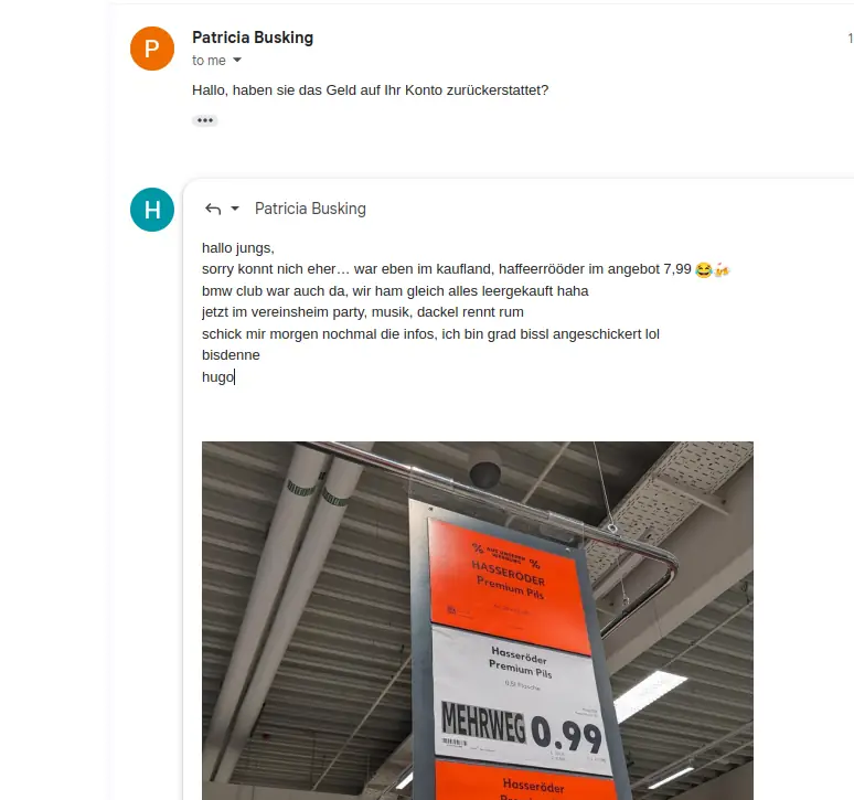 Nachdem die Betrüger mit Millionen um sich warfen, kam Hugo mal wieder auf den Boden der Tatsachen: „Jungs, ich hab höchstens 750 Euro!“ schreibt er ehrlich. Schließlich ist das keine Blockchain, das ist Wanne-Eickel. Und bevor er das in eine „magische Karte“ investiert, will er wenigstens wissen, ob’s dafür eine Garantie oder Quittung gibt.