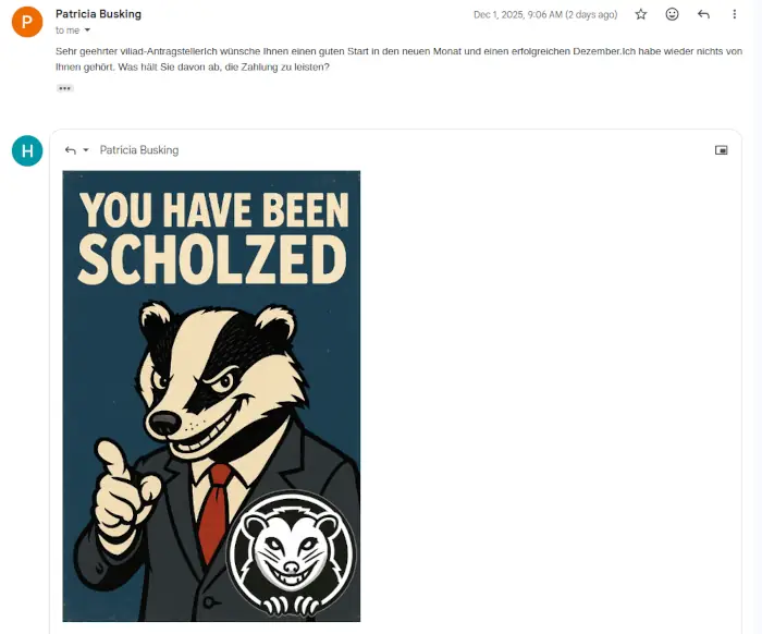 Hugo leitet den Scammern nur lässig den Screenshot weiter und fragt: „Was soll ich tun?“ Dann lehnt er sich zurück, der Dackel rollt schon Popcorn in den Napf, und beide warten gespannt, ob die selbsternannten Blockchain-Engel jetzt auch eine Antwort auf deutsche Bürokratie haben.