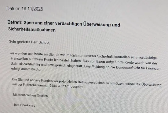 Auch Scammer sollen sich mal freuen und wir geben wieder einen fingierten Überweisungsbeleg raus. Mit naiver Absicht verwenden wir nicht den geforterten Betreff, sondern legen den Grundstein für “Bank verweigert die Überweisung”. 😁