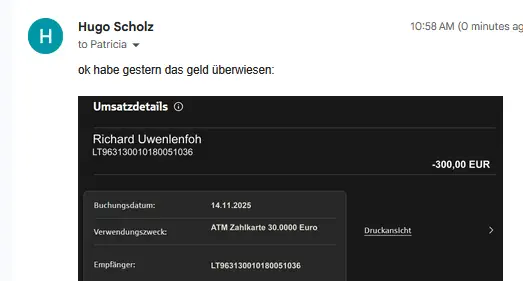 Und da ist sie: die große Enthüllung. Für eine angeblich „nicht zurückverfolgbare Wunderkarte“ soll Hugo plötzlich eine Überweisung nach Italien tätigen – an einen gewissen „Richard Uwenlenfoh“ über die Bank zen.com. Zahlungsgrund: Familienunterstützung.