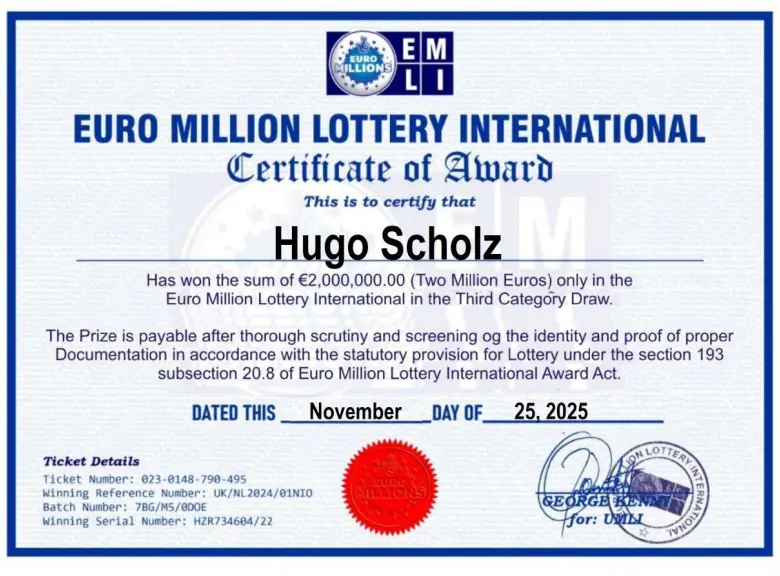 Ihr Los mit der Nummer 023-0148-790-459 und der Seriennummer HZR734604/22 hat die Glückszahl 11 gezogen. Herzlichen Glückwunsch! Sie haben soeben 2.000.000,00 € (zwei Millionen Euro) bei EURO MILLIONS OF JACKPOTS gewonnen. Wir entschuldigen uns für die verspätete Antwort, da wir mit der Zusammenstellung der Namen sehr beschäftigt waren.