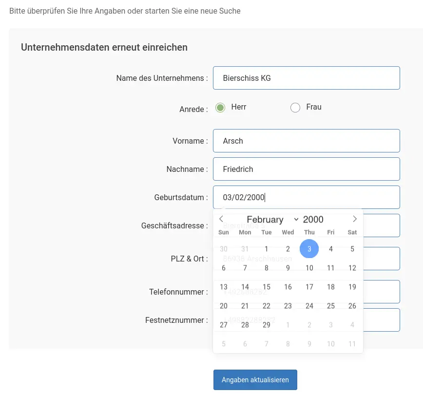 Zunächst soll man den Unternehmensnamen eingeben. Kurz darauf erscheint die Meldung „Unternehmen erfolgreich gefunden“. Die angezeigten Daten sind allerdings offensichtlich generisch oder schlicht falsch. Genau das ist Teil des Spiels: Man soll die Angaben „korrigieren“ und seine echten Daten eintragen.