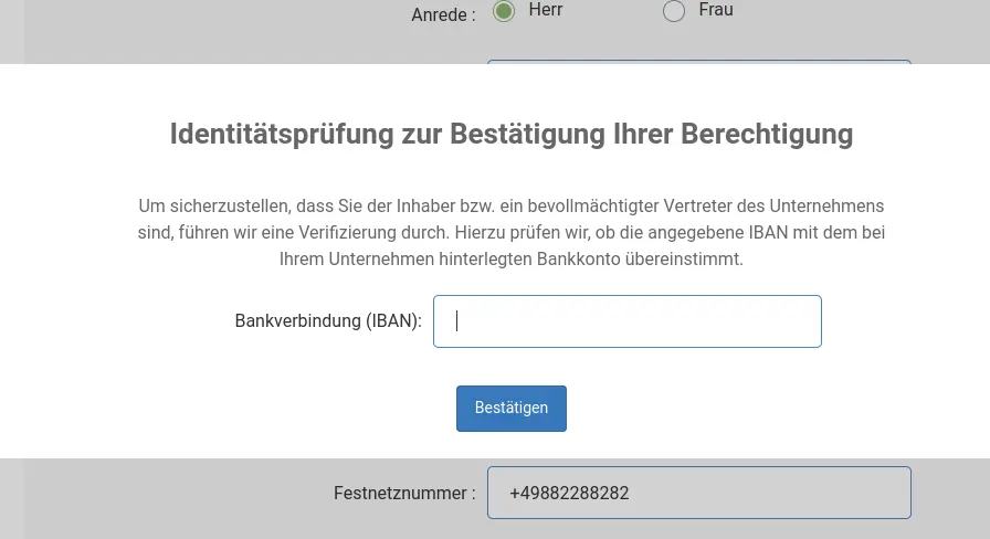 Der eigentliche Zweck folgt zum Schluss. Zur „Identitätsprüfung“ soll die IBAN angegeben werden. Angeblich werde überprüft, ob diese mit dem hinterlegten Bankkonto übereinstimmt. Eine Behörde, die bereits ein Konto hinterlegt hat, müsste dieses allerdings nicht per Webformular erneut abfragen – schon gar nicht nach einer Droh-Mail mit Drei-Tage-Frist.